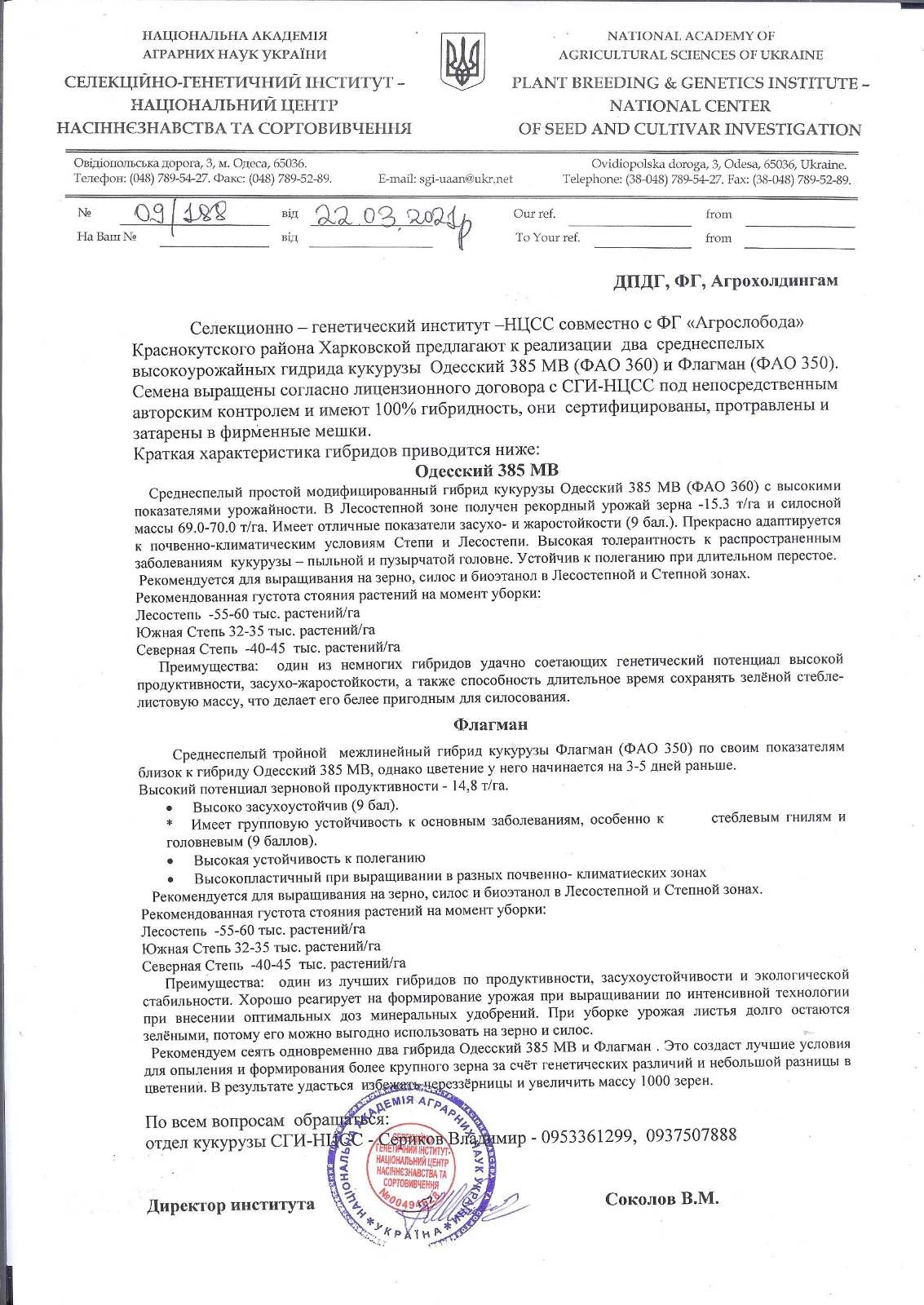Хозяйство является производственным плацдармом, испытательной площадкой для научных разработок селекционеров, микробиологов Одесского селекционно-генетического института Национальной академии аграрных наук Украины. Сегодня здесь выращивают сорта озимой мягкой и твердой пшеницы, озимого и ярового ячменя, кукурузы, подсолнечника, сои, нута, гороха, люцерны. Дело в том, что сорт и семена, как в прошлом, так и в современных условиях остаются самым дешевым и наиболее важным фактором подъема аграрного производства. Важным элементом эффективной деятельности в данном направлении является функционирование собственного завода для осуществления работ по калибровке, очистке, протруению семенного материала.
